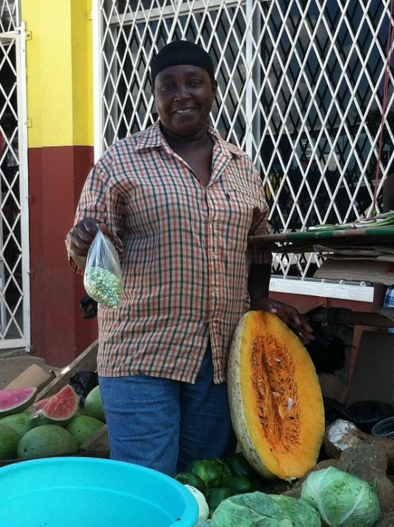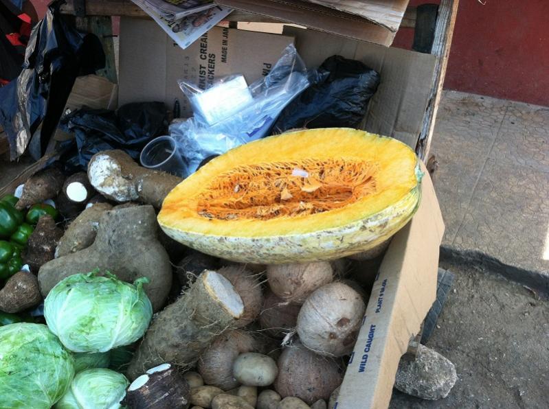 Later in the day, we went to the market to get some vegetables for the week. This vendor had some pumpkin, dasheen, cabbage, Irish, coconuts, green peppers and various yams.