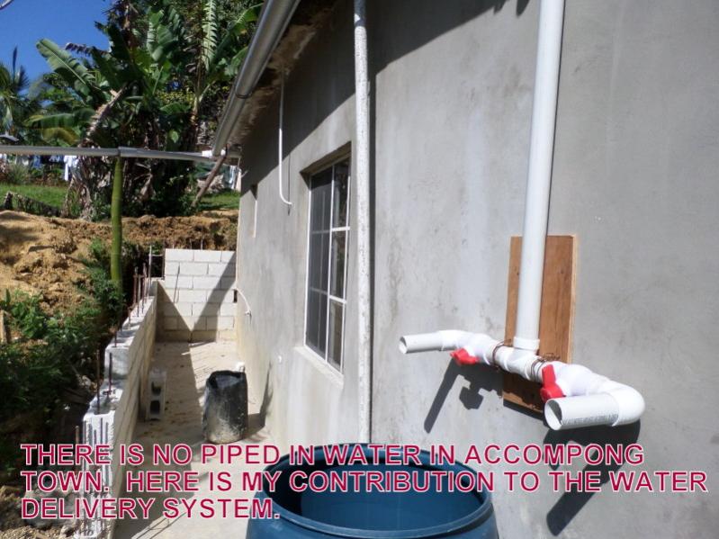 Accompong Town has no piped in water so we have to rely on rain water for all our needs. Separating the drinking water from storage tanks which supply the sinks, shower and toilet was a problem. I put some ingenuity to the task and devised this system. Many other residents stopped by to note how I did it so they could do something like it and a few even wanted to hire me to do one for them.