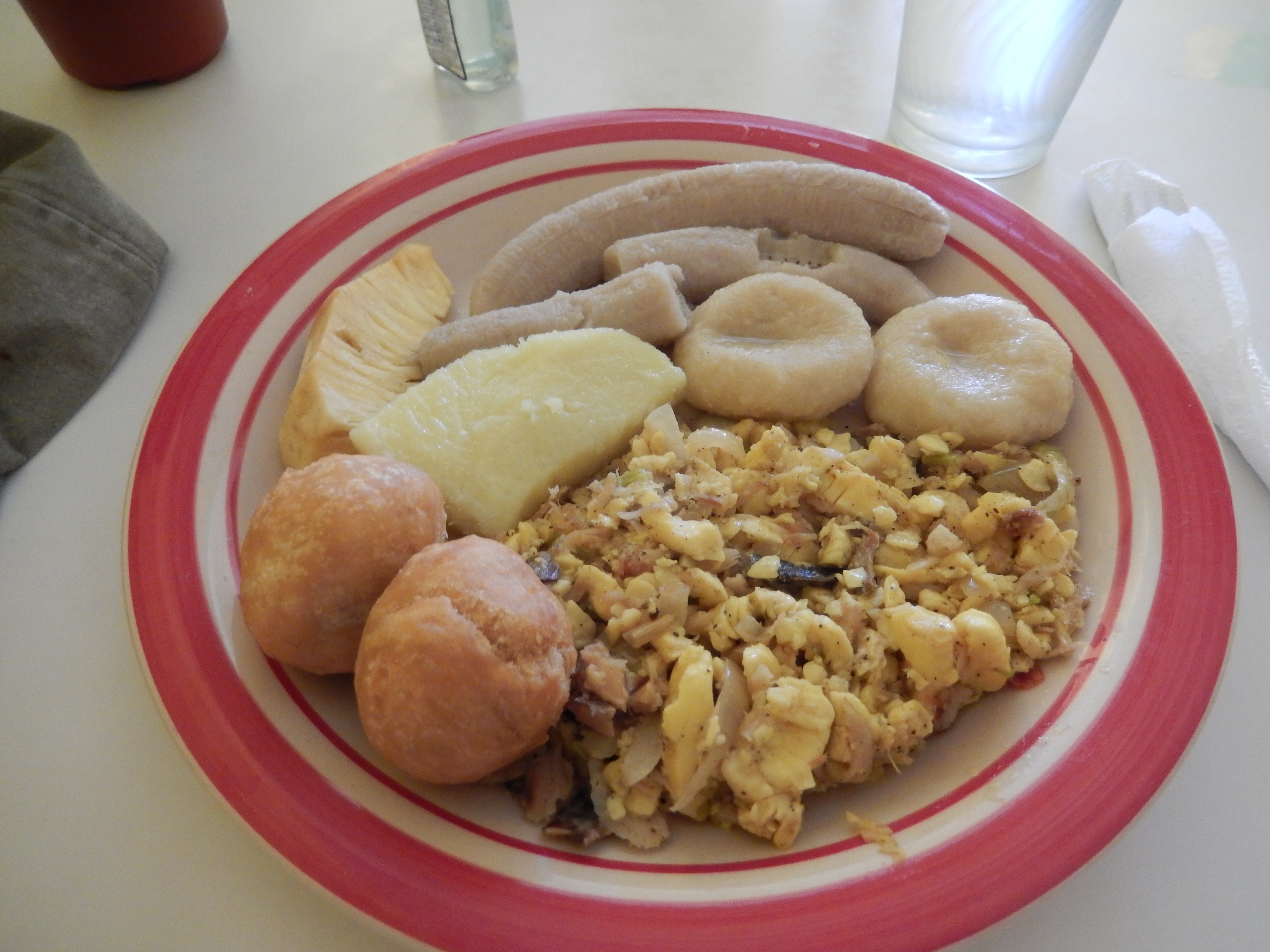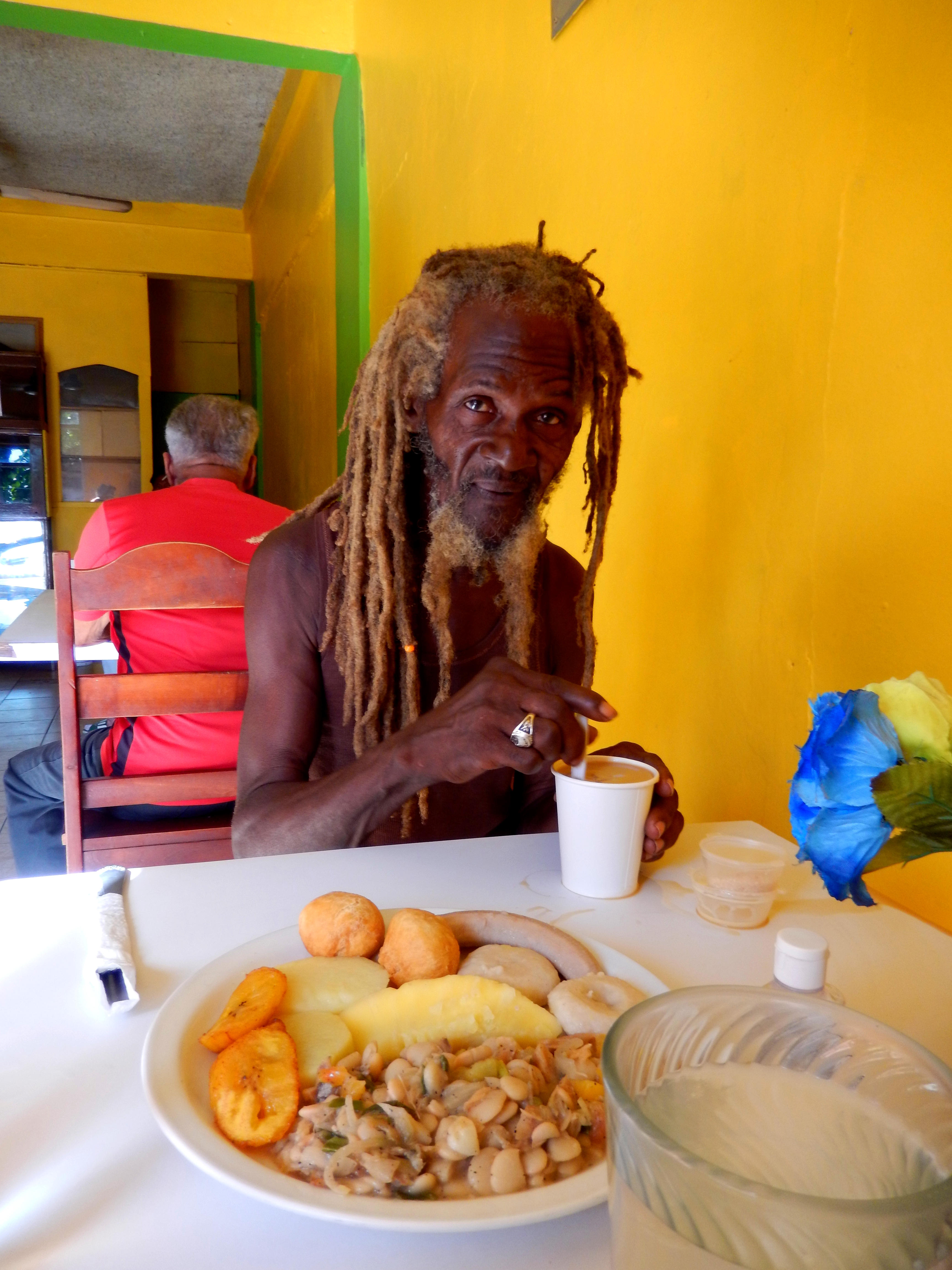 Markie at Blossom's. The breakfast is salt fish and beans.