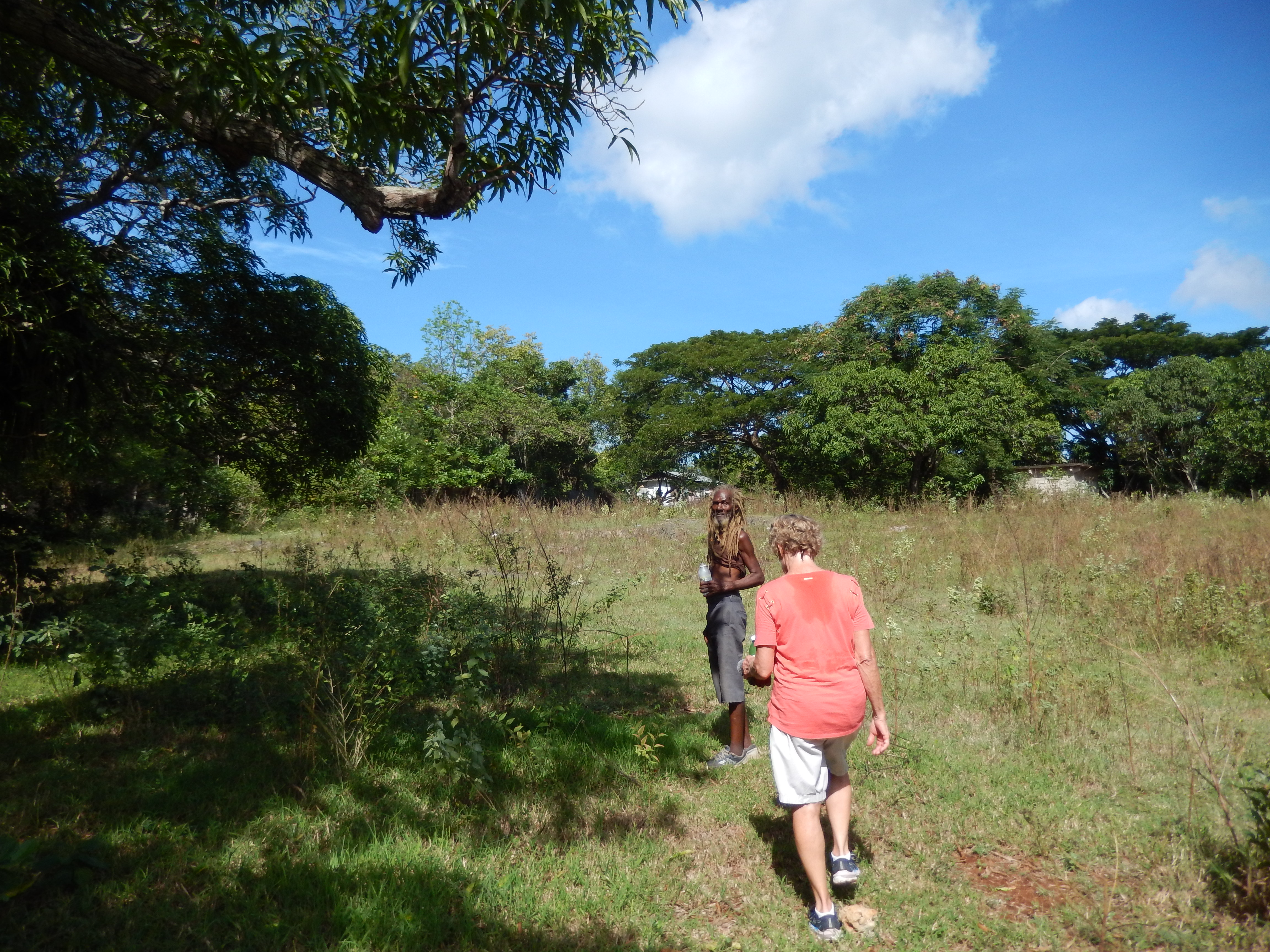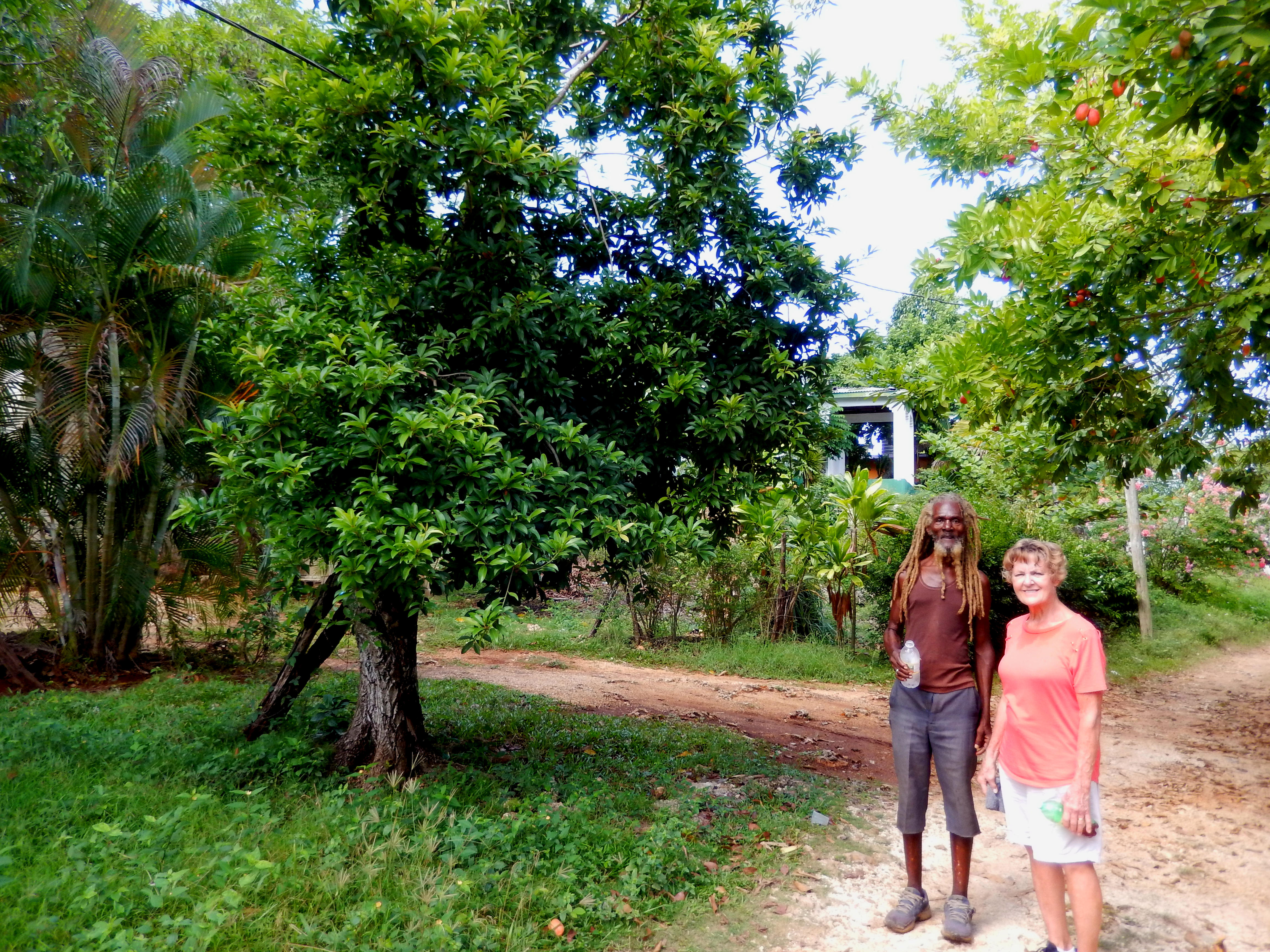 Every year we try to take a walk back into Deep Red Ground. We give our friend Markie a couple of bucks (actually more than that!) to guide us and keep us safe. I'm normally not to worried about safety, but we would get lost every time without Markie. We started off at Blossoms Restaurant which is right across the street from the Negril Firehouse. There is no sign out front and the breakfast menu changes everyday on the chalk board. The food is good and the prices are some of the cheapest you will find. Normally we get the medium plate which is $750 JD. Blossoms is usually pretty busy, but there is always a place to sit. Markie took us there a few years back and it is our go-to breakfast place when we are in town. They also have lunch and dinner but we haven't eaten there for those meals. Anyway, we met Markie there at 9 AM and had a filling breakfast and then headed up the road toward Red Dragon. As a side note, Markie always gets a large portion for breakfast then polishes off anything that we don't eat. You would never know he could eat so much as skinny as he is. We walked up past Red Dragon and took a few photos at the water tanks overlooking 7 mile beach. After that short stop we kept going up the hill and eventually took a right through some properties. Markie was greeting friends all along the way. Soon there were fewer and fewer houses and then just a trail. He would tell us about the trees and plants as we passed them. About an hour into the trip we came to Fuzzy's house, but he wasn't home. We kept walking and soon were on our way downhill. We popped out on the road right next to Quality's Restaurant on One Love Drive. It is always a nice leisurely walk and we see new things each time.