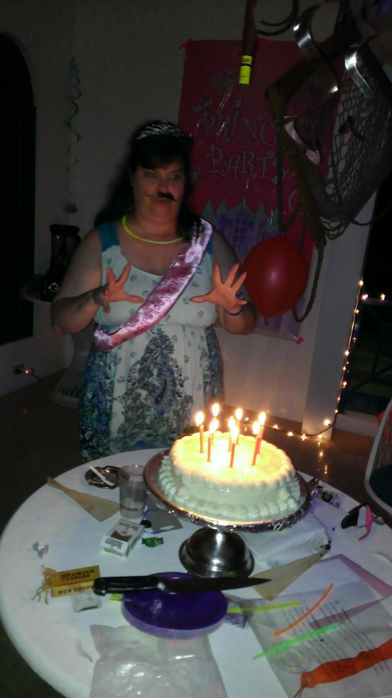 It was then back to the porch for birthday cake. Fake mustaches and tiara’s/crowns for everyone. Why? Who knows, it seemed necessary at the time. Everyone did seem to be having a great time even though we looked ridiculous. Also, the cake that Treehouse had made for the occasion was unbelievable! (There was only one tiny piece left and Birthday Princess ate it the next morning.) We danced, sang and told funny stories for a couple of hours. About 11:30 JK came out and let us know (not so subtly) that it was time for everyone to go – she had skipped dinner and she seemed to be feeling even worse than before.