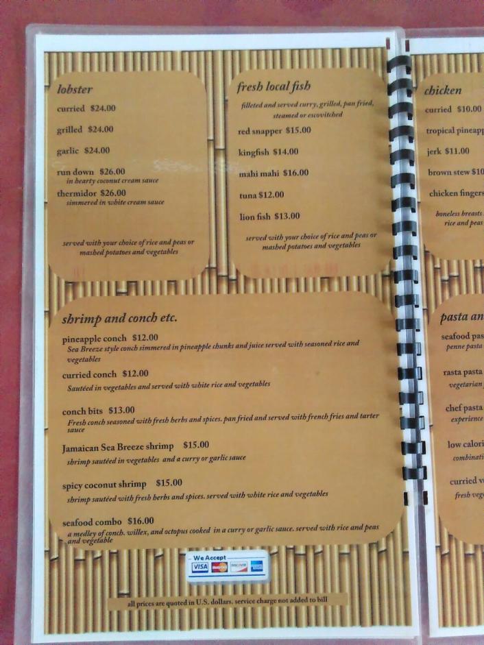 :)Welcome vistiors to Sea Breeze Restuarant & Bar , we are located on the west end rd of Negril at the intersection of the westland mountain rd, we specialized in sea food, conch, fish, lobster , swrimp etc, we also do the Sea Breeze famous jerk chicken,oxtail , vegetables,etc, we also do natural juices, carrot,beetroot, orange, pineapple, cucumber etc, we open for breakfast, lunch and dinner