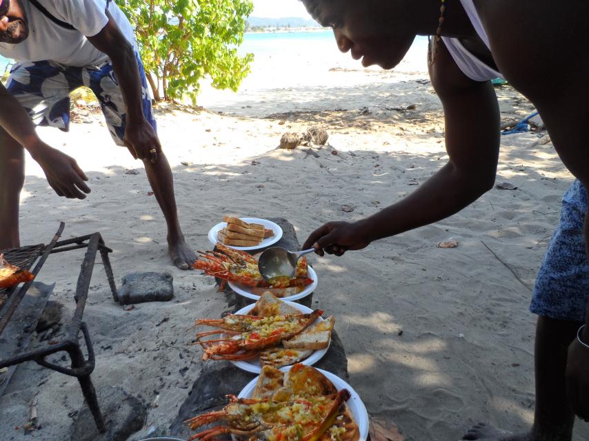 We all have our top 5 days in Negril that seem to be few and far between as we spend more time on the rock, but we had one of those days thanks to a couple of ladies (not that kind of ladies) that we met at The Pineapple. Believe it or not, it is a small world out there. Keri and Jamie came into out lives by chance as most new friends do while in Negril. And the small world thing comes into play as we find out that they live a mere 2.5 hours away in our state of Iowa. They were supposed to be part of a group coming down but Keri and Jamie were the lone explorers left in the bunch. While talking to them we find out that they are Jamaica and Negril virgins, never stepped foot on the rock, and looking for an adventure. So, Cindy and I would run down to see my friend Desmond (next to the Boat Bar and The Mariposa) as see if we could fit in a day of snorkeling at the reef and then onto Booby Cay Island for some lobster. Out Captain Jonny and diver Christopher picked us up and we were on our way. It was a bit murky at the reef due to choppy seas but still a great time. I am not quite sure how the conservation about Hedo got started but Jonny was going to go by and check out the naked people. Thinking that we would stay out a ways from the ropes was incorrect on my part. Hell, I could of reached out and touched the ropes. Oh the naked humanity!!! On to the island we went cracking naked people jokes all the way there. We broke out the Red Stripes immediately upon exiting the boat. As Jonny and Christopher prepared the lobster for the fire, the 4 of us decided to explore the rest of the island. There was a path that took us to the backside of the island which we found a very secluded beach. It was a great place to take some pictures and play in the water a bit. And that's where we will end the story of the secluded beach and pictures (K & J). I once thought that 3 Dives had the best lobster on the planet but, I now know that Captain Jonny prepares the best lobster, hands down. OK, the lobster Thermidor at Catcha comes close but no cigar. You gotta try it to believe it! It was a fun ride back to the beach as our white moons and 1 black moon (Christopher) came out as we passed a catamaran and another boat. As the 4 of us shared a table for dinner, we were all smiling at the great day that we had just experienced. I hoist a glass to my beautiful wife and our new friends who gave me a top 5 day.