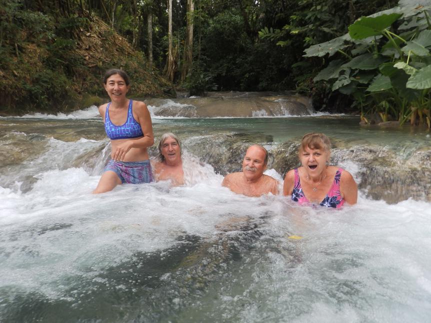 Blue Cave was great as usual, now with the addition of a lifeguard. We stayed in the lower tower room, the least expensive on the property with no a\c (not needed) and no TV, also not needed. We met a few couples new to Jamaica and we were helping them out with places to eat and things to do. Four of us used Collin's taxi for a trip to Mayfield Falls and then to Roaring River. We had been to Mayfield Falls a few times before but love the place. It was our first trip to Roaring River. I had brought an inexpensive underwater camera ($60) and took a bunch of photos at both places. However, I lost the camera somewhere at Roaring River, either at the "deep hole" where I may have put it down and didn't pick it up or on the steps outside the cave where I sat to dry my feet and put on my shoes. Didn't know it was missing till we got back to Blue Cave. Oh well. When we told another couple about our day they decided to do the same trip with Collin 2 days later. I gave Collin all the info about the camera and who our guide was at Roaring River and told him I'd pay $50 for the camera or $25 just for the card. Collin checked for us but to no avail. We did get a few photos from the couple we went with, including of me jumping out of a tree at Mayfield falls.