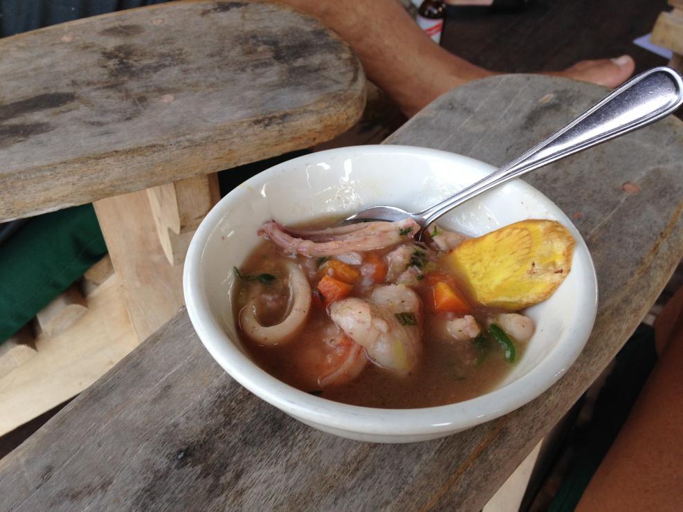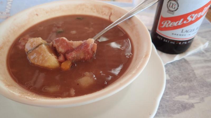 Cosmos red pea soup & Red Stripe beer...