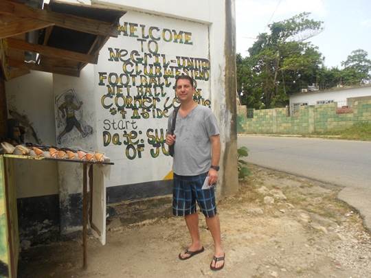 Right on Jerms! Also, Dr Feelgood (located right across from Negril Escape) runs a soccer (football) league for the area youth. The field is behind his stand and the Central Park area. In this photo, you can see an advertisement for the league painted on the wall behind me. Dr. Feelgood accepts donations of soccer supplies to help run the league. I have also given cash donations in the past.