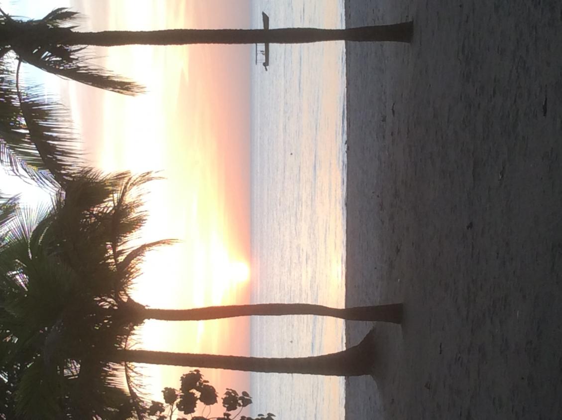 This is the sunset view from the beach veranda at Nirvana. Same view as the owners villa. Both unbelievable and unbeatable. I could lay in bed and watch my wife in the surf too!
