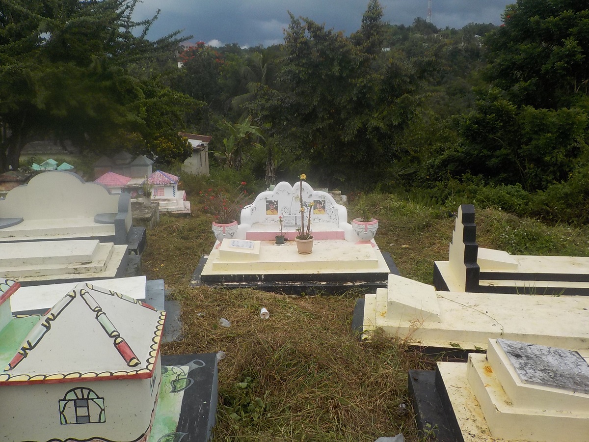 We pulled into the entrance to the cemetery and parked amid a large group of community members who were “bushing” the town. “Bushing” included cutting weeds with machetes, raking debris and partaking in a social event which helps bond the young and old and boosts the pride and moral of the citizens. We were greeted by Kerry Ann and I took her aside to pay for the tour of my “family” and to make sure there was a little extra for her after she has to give a portion to the town which helps pay for programs like “bushing” etc. assuming things worked as intended. They don’t always do.
