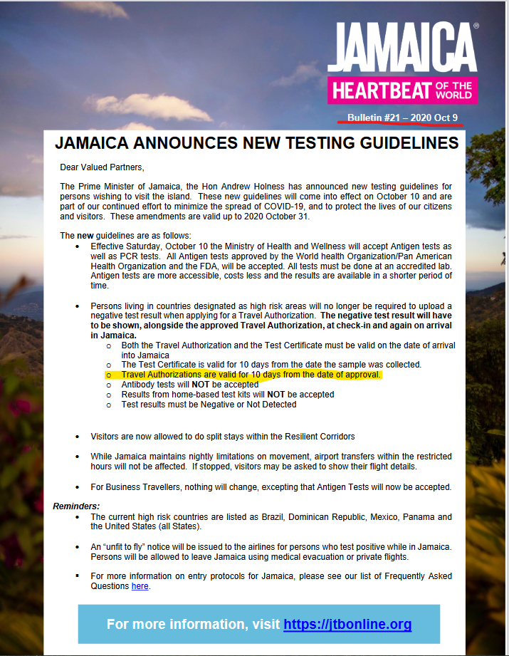As of 2am October 9, the JTB website is still showing that a Travel Authorization is REQUIRED!