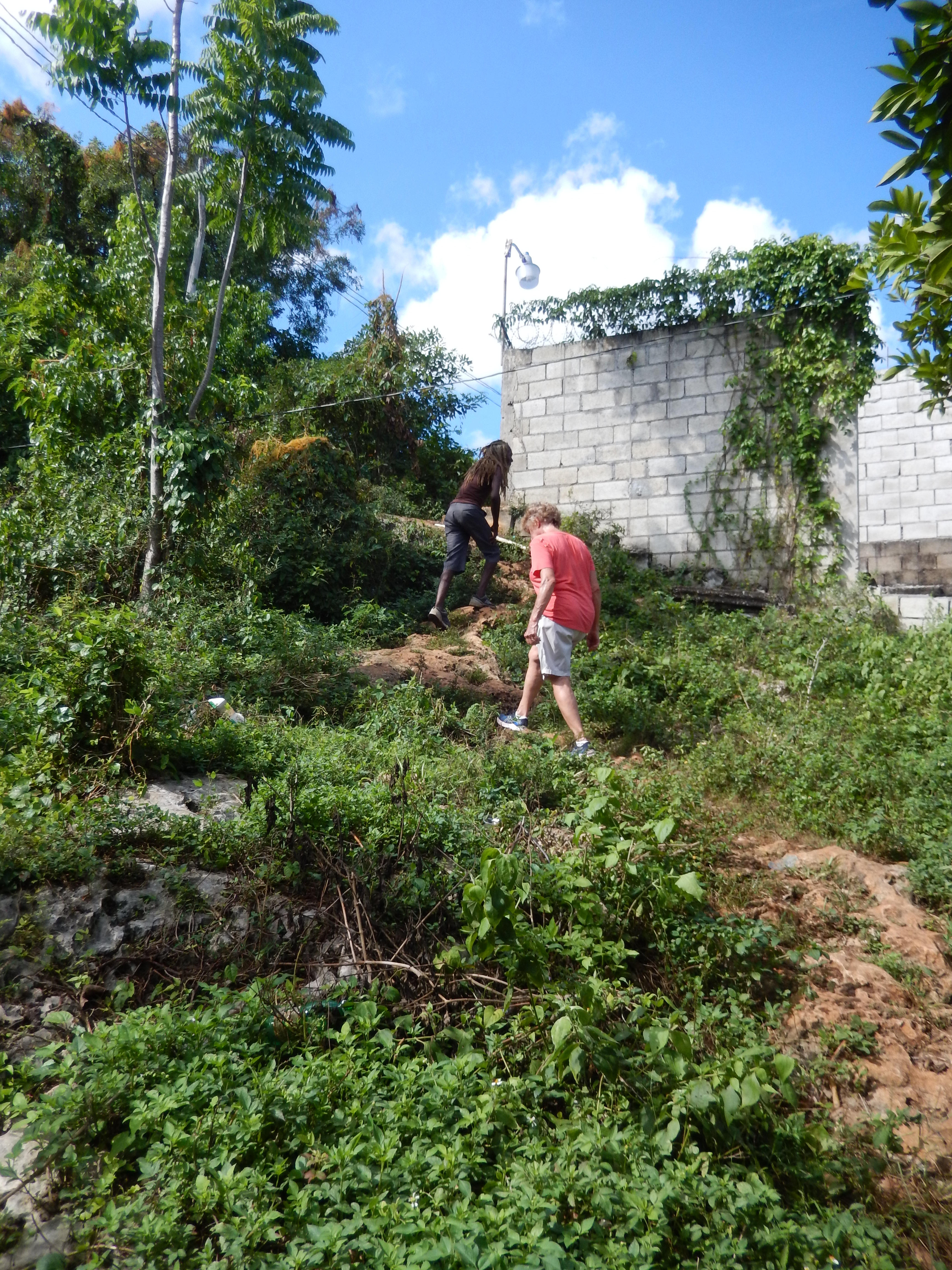 Every year we try to take a walk back into Deep Red Ground. We give our friend Markie a couple of bucks (actually more than that!) to guide us and keep us safe. I'm normally not to worried about safety, but we would get lost every time without Markie. We started off at Blossoms Restaurant which is right across the street from the Negril Firehouse. There is no sign out front and the breakfast menu changes everyday on the chalk board. The food is good and the prices are some of the cheapest you will find. Normally we get the medium plate which is $750 JD. Blossoms is usually pretty busy, but there is always a place to sit. Markie took us there a few years back and it is our go-to breakfast place when we are in town. They also have lunch and dinner but we haven't eaten there for those meals. Anyway, we met Markie there at 9 AM and had a filling breakfast and then headed up the road toward Red Dragon. As a side note, Markie always gets a large portion for breakfast then polishes off anything that we don't eat. You would never know he could eat so much as skinny as he is. We walked up past Red Dragon and took a few photos at the water tanks overlooking 7 mile beach. After that short stop we kept going up the hill and eventually took a right through some properties. Markie was greeting friends all along the way. Soon there were fewer and fewer houses and then just a trail. He would tell us about the trees and plants as we passed them. About an hour into the trip we came to Fuzzy's house, but he wasn't home. We kept walking and soon were on our way downhill. We popped out on the road right next to Quality's Restaurant on One Love Drive. It is always a nice leisurely walk and we see new things each time.