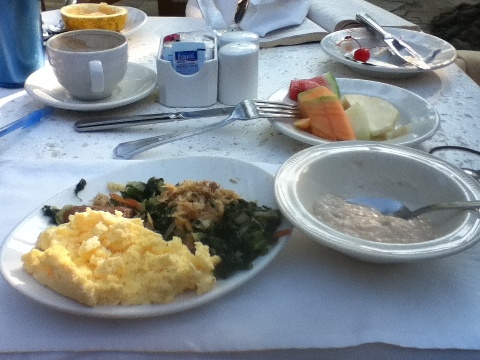 Breakfast was by far my favorite meal of the day. We arrived every day when they opened at 7 AM. I’d start with a Blue Mountain cappuccino and a plate of fresh fruit. I’d work up to fresh, steamed vegetables, saltfish, eggs, and a side of corn meal or oatmeal porridge. I fell madly in love with the porridge, filling up a bowl to keep in my room fridge. On my last breakfast, there was no corn meal porridge so Bruce whipped me up a special batch and I asked him to marry me. I could not leave that day without one last bowl. It was love in a cup, divine comfort. After two hours at breakfast, I brought a small Tupperware to fill with callaloo and to bring to the beach.