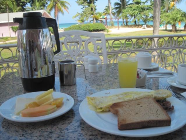 Breakfast at 10:30 was a callaloo omlette made to order by a chef with a smile that could light up a city. Plus some sweet fruit and wheat toast…..doing good on eating healthy despite the unending options. I love eating outside and was not lonely long. Several birds joined me and one was trying to boldly steal right from mi plate. Oy. I kept saying NO SAH and he finally stayed on the chair lol. Observation: Best job in Negril – being a bird at an all inclusive.