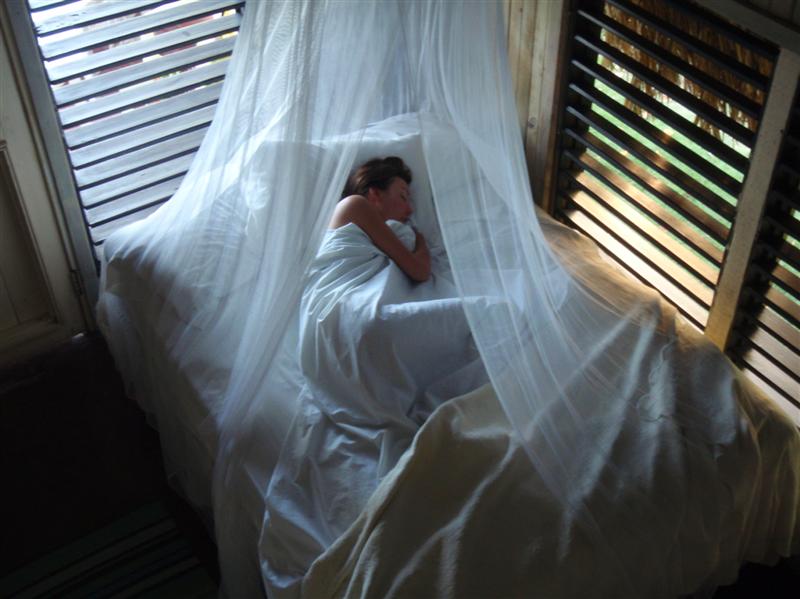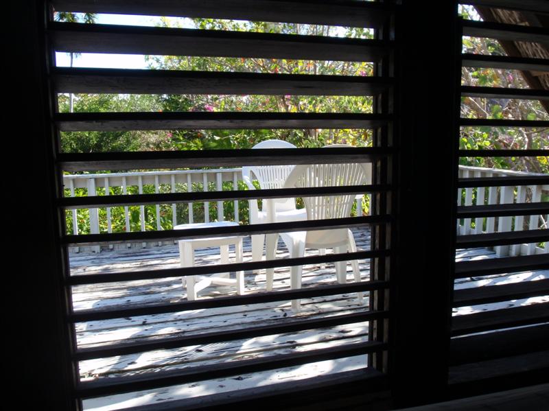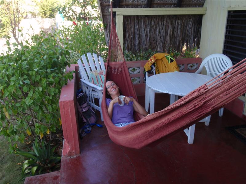 Sitting areas- hmmm...depends on what you want. A-Frame has a partially covered verandah with chairs and a cloth hammock, whereas Round House's verandah is not at all covered. The A-Frame has a neat back upper deck which is great for bird watching as it's right in the trees. Round House has a shady yard area with some chairs and rope hammock.