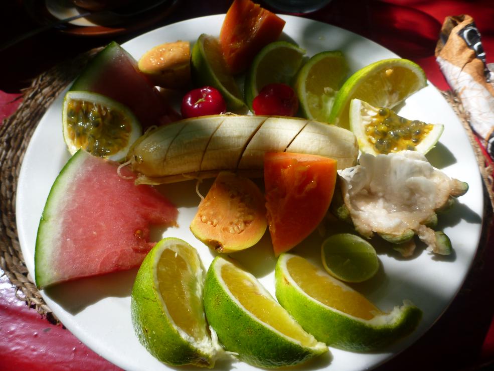When we arrived, Emile showed us around the place. We picked a table towards the back of the garden next to a...massage table? We didn't even need to look a menu. Fruit plate for me. Breakfast burrito for +1. Green juice and coffee to go around.