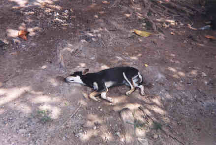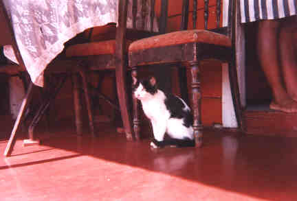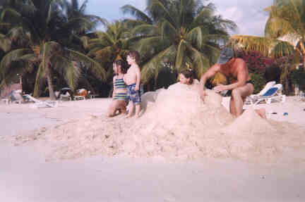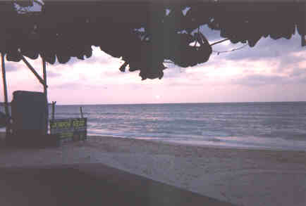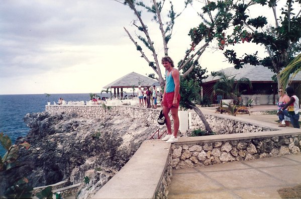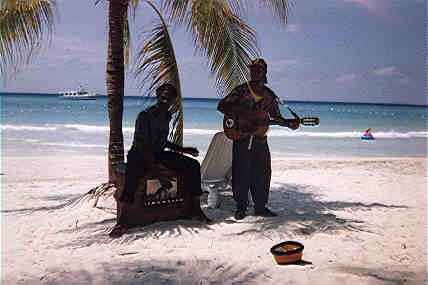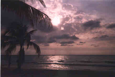 Woke up before dawn. (We got plenty of sleep the night before after the ganja tea experience at bloody bay. Sheesh! Slept through the sunset and the whole evening!) What a quiet, peaceful time on the beach! The only living soul we saw on the beach from our room at Charela Inn was the night security man and an occasional cat slinking through the shrubbery. Kind of nice to just sit back, with a cup of coffee (laced with Baileys) and watch the beach wake up. The sea was so calm when the sun came up it looked like a mirror stretching to the horizon. The sounds of the tree frogs are slowly replaced by the singing of the birds. The fishermen in their dugout canoes are paddling out to the reef and an occasional walker or jogger passes by. Then the fruit and oj vendors start to pass by, followed by other vendors on their way to set up their beach stands.