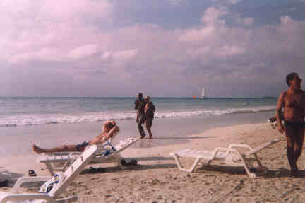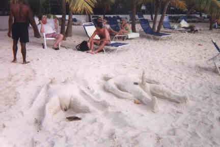 Spent the rest of the day on the beach. Charela has Sunfish, a Catamaran, Sailboards and Sea Kayaks for its guests. I’ve always been intrigued by the idea of sailing on the ocean. However, I have no real sailing skills whatsoever! But it didn’t look so hard to sail. I’d been watching boats for the last two days and I thought I could handle it. WRONG!! Everything went fine until I was about 30 feet from shore. Then the boat just stopped and wouldn’t go anywhere. Fatfish and Ray from next door at White Sands were takin’ a dip when they saw me in the stalled sailboat. "How come you’re not moving?” “I’m just waitin’ for a puff” was my answer. I’ve heard sailors talk about puffs of wind so I thought that would sound like I knew what I was doing. NOT!! All in all I think I dumped the Sunfish 4 times. Once while trying to light a cigarette, twice on the ropes around the swimming area and the last when I was almost back to shore. I was just sure everyone on shore had a good laugh while this fiasco unfolded in front of them! The last time the boat flipped over I couldn’t get it righted. Had to have Cedric swim out and help me back to shore. How embarrassing! However, no one on the beach seemed to be looking at me when I finally made it back to shore. They were all just staring out at the ocean with wry little smiles on their faces. Fatfish, Carol and Kay watched the whole thing. When we walked over to White Sands Fatfish wanted to know what it was that I stuck in my mouth just as the boat went over for the third time. (It was a $500J bill that was floating in the bottom of the boat from the time I dumped it while trying to light a cigarette.) I didn’t loose my Red Stripe hat and sunglasses so that was a small victory. Cigarettes and lighter were never seen again. Guess I’ll just stick to sunset cruises for my sailboating.