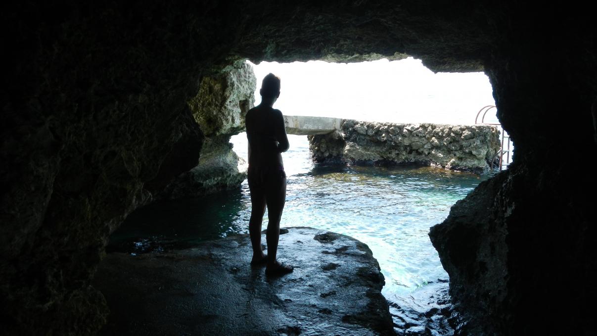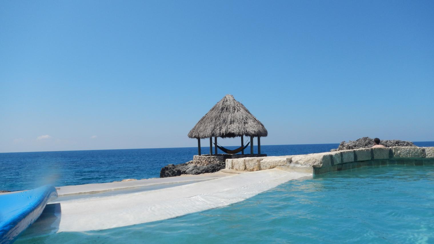 We wake up rested, in spite of the fried food hangover. After figuring out the in room coffee maker, and getting said coffee, we head down for some breakfast.Let me just tell you that the kitchen at Seastar puts out the yummiest, warm, blueberry muffins I've ever had.My mouth waters just thinking about em. And they are no slouches on the coffee, too...hit the spot.Our plan today is to either walk to...or cab it over to place where we can chill for the day cliffside, get a round or two of redstripes, some lunch, and snorkel/jump/swim/sunbathe...Our friends from the previous night at Canoe arise(I hate this,it was a group of like 8..all from Winnipeg..we love you, but for the life of us can't remember your names..as we went our way, and you guys went yours, diving, beachin' it, etc)...anyway, they tell us to go check out Tensing Pen, right across the street...So, after some after breakfast transitioning back at the room, we venture out down the lane. Careful cross a scary section of One Love drive, and are at the gate of Tensing Pen, where the guard lets us in...after fumbling a bit to find the path, we find cliffside HEAVEN!!..For all those who have been to Catcha and love that location, let me tell you that this rivals it very closely.Awesome vistas, the layout of the terraces, and concrete work on the cliffs, and buildings is breathtaking...We are very quiet as we check it all out, but we feel a bit like a fish out of water. This place is so quiet, and serene...and practically empty?, that we feel like trespassers, and maybe rightfully so. We were let in, but don't feel sure if we are really doing the right thing to make this our "hang out" today.So, after a few pictures, we decide to try Xtabi..as I've read that it encourages visitors. 1st...a stop a wise choice grocery...many of you may think this wrong, but Lisa and I like to get our drink on, so we decide that a couple of sixers for $1,500 J is fair, and take them back to the Seastar bar, for some icing down in our collapsible Thermos cooler which looks like a purse, of sorts...(yes, folks..we smuggle a few...been doing it at festivals back home for quite some time, it's a habit of ours)...Now, we're ready for some cliff action!