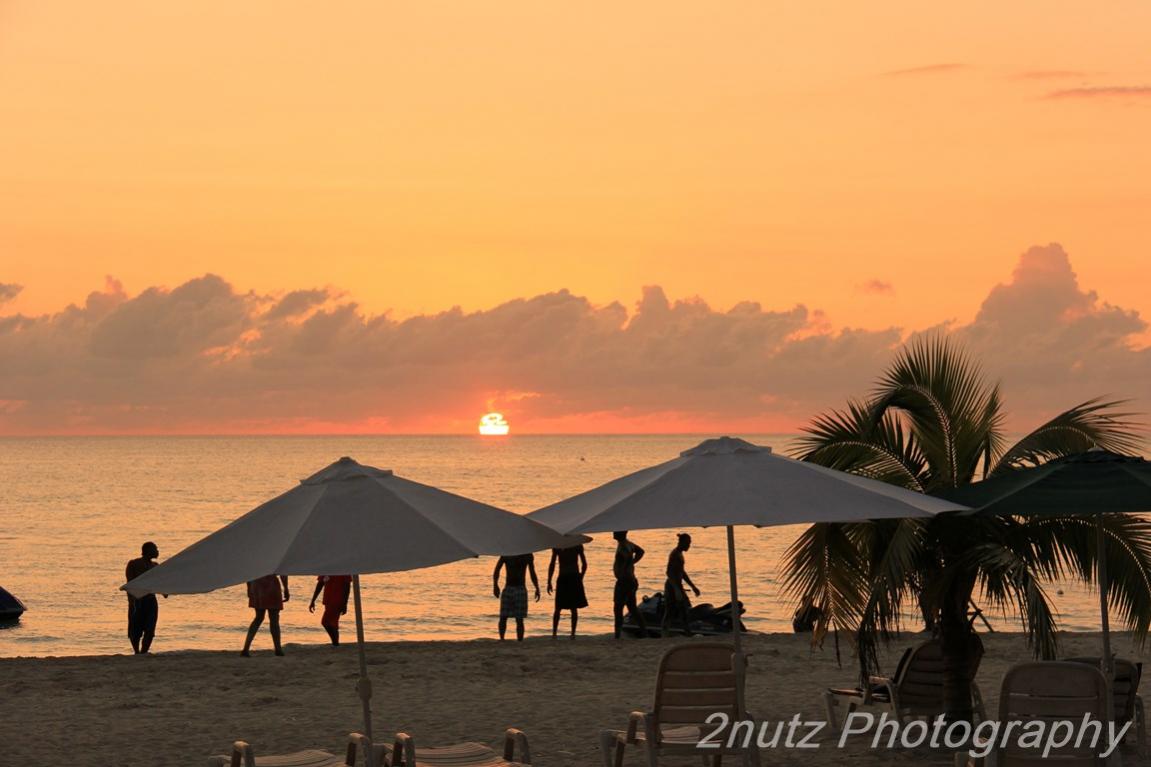 a bunch of Jamaican kids playing soccer on the beach as the sun was setting...