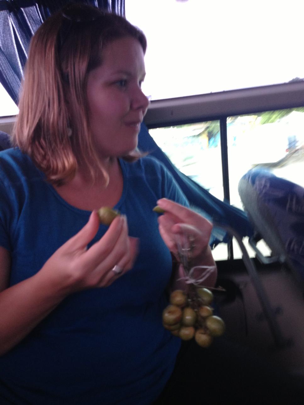 After chatting up our driver and the other couple on the bus, we realized we had a bit more of a wait, so we ran over and grabbed some patties and waters. After about a half an hour wait (which was annoying, but we expected it after researching, so it wasn’t the end of the world) we finally got off on the road. MBJ was pretty busy so it took quite some time to just get out into the country side. On the way our bus driver stopped and bought us a bunch of the grape-like fruits that have a jelly-like inside with the hard shell on the outside, which were delicious! We also had to stop at those Grand Pala-whadducall’um AI resorts to drop a few folks off – woah, so glad we didn’t go that route for a hotel. Just so, so not our style and way too ‘luxury’ for our tastes. We continued on, and moved to the back of the bus since it was raised up and we could see better. We thoroughly enjoyed the drive into Negril! It rained just a tad, although it looked as if it’d rained more heavily earlier in the day since there were some puddles and the roads were still wet. Attachment 30630Attachment 30631Attachment 30632Attachment 30633