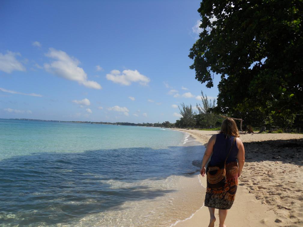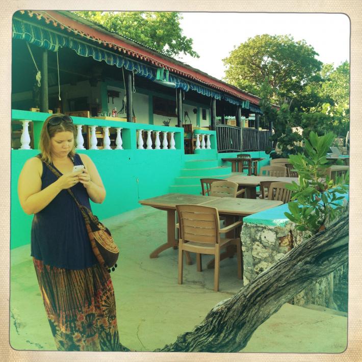 Once we emerged onto the beach it was as if time stood still for a few moments. We turned in wide circles, wondering why there were basically no people to be seen. We shook off our shoes and stuffed them in our bags and we set off. The water lapped at our feet as they sank into the sand. We took a few photos as some beach boys emerged from the shady trees up the beach a bit, all in varying states of awake. We figured we’d start moving and the rebuffing of the boys thusly officially began. We kept moving and said no to everything you’d expect: ganja, snorkeling tours, glass bottom boat and jet ski rides, rides on the backs of motorcycles to the ganja fields, Jamaican boyfriends (I was actually surprised that these precise words were used – ha!), escorts on our walk…we took it all with a grain of salt and kept moving, saying many, many versus of, “no thank you, no thank you!” and “respect!” – no problem.