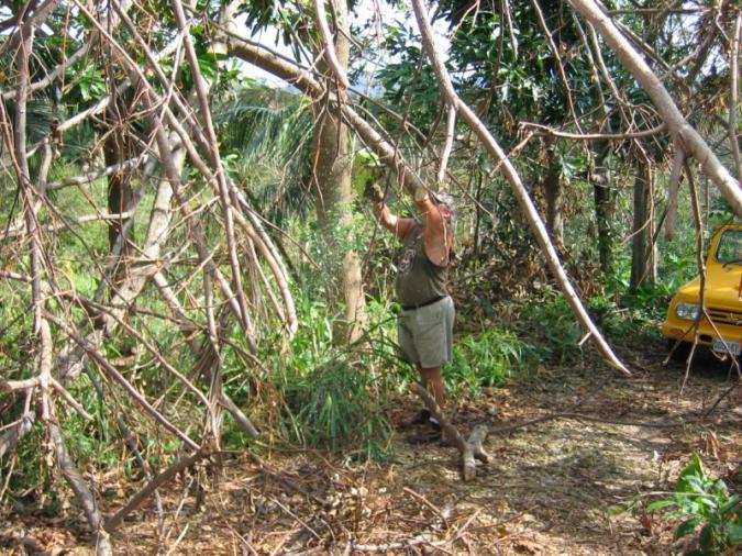 I am in total shock and heartbreak over the losses. I know once we have cleaned up and put things back together we will be moving. This will never be home again! On the positive side you find out who your real friends are. My best Friend is from Nashville Tennessee and has been going to Negril with us for over 10 years. He and his family were following Hurricane Ivan and knew the Damage the Islands had already suffered and feared for us. On the morning after Ivan the called to see if we were ok, we told them our story. He then said he had a truck loaded with a generator for Power, a window ac, food, water, chain saws and fuel and were headed our way to help in clean up. Then the owner of our company called to see how the store was and how the other employees and I fared as they are a hour east of us and had little damage. Once again I told him our story the other employees had fared well, the store was fine but our house looked like a bomb had gone off. We are in the fishing industry and have a walk in cooler full of frozen bait that was thawing and he said he had two guys to come and get the bait that day. Once he heard of our dilemma he said he would put together a work crew and be at the house in less than 2 hours. They arrived just before my friend and his dad From Nashville Tennessee that had left a 3 in the morning. That afternoon my boss, the manage of our Panama city store, manager of my Port St Joe store and Warehouse manager plus Corey and his dad and myself managed to cut our way thought the forest of down trees to the house.