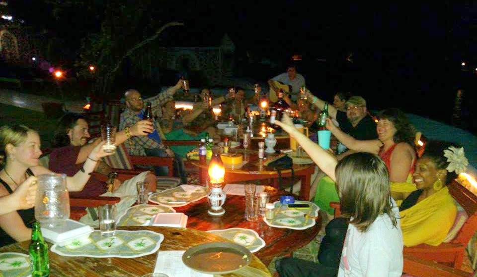 We get two vans together and head down. As we arrive at Blue Cave I tell Petrona how our group grew (Petrona actually doesn't work at the restaurant but at the hotel, but jumps in to help us right away) and we all assure her we will do everything we can to get us all drinks and dinner, and so it begins. Some of the guys move the very heavy wooden tables and chairs into one huge table by the sea. You can see the area where we sat in the left of this photo, by the sea wall.We moved ALL of their tables to that spot.