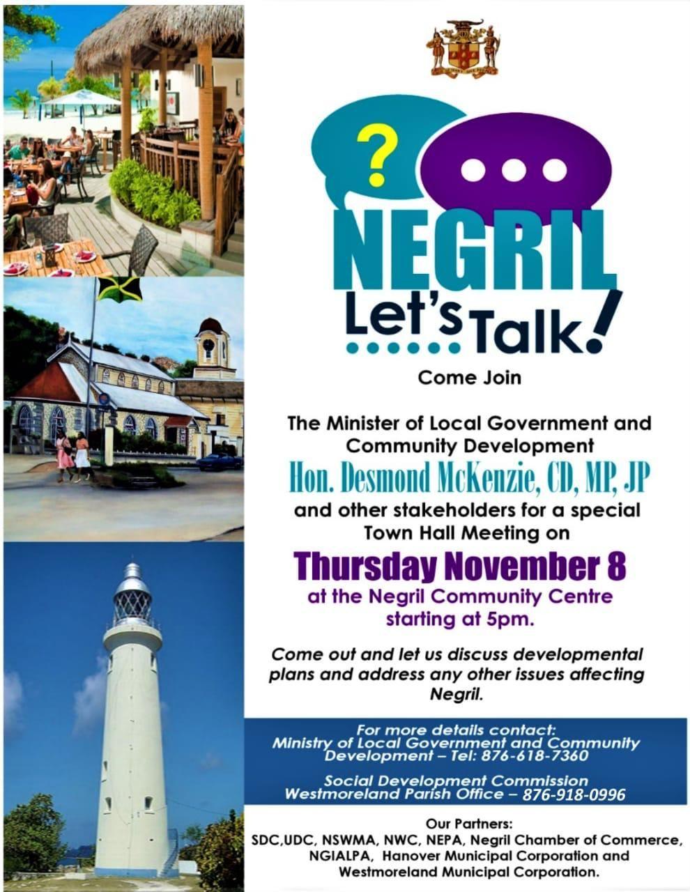 You are invited to attend a special Town Hall meeting called by the Minister of Local Government, Hon. Desmond McKenzie on Thursday November 8, 2018 at the Negril Community Center starting at 6pm. Please see attachment for more details.