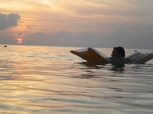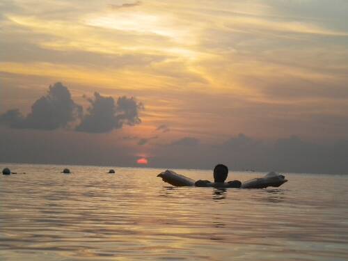 Watched sunset. Just lounging on my float. Cloudy. Beach was deserted. Even the higglers/vendors took a break to rest up for the night work I guess. Beautiful sunset. Water fells so good. Bath water. Crystal Clear. White sand.