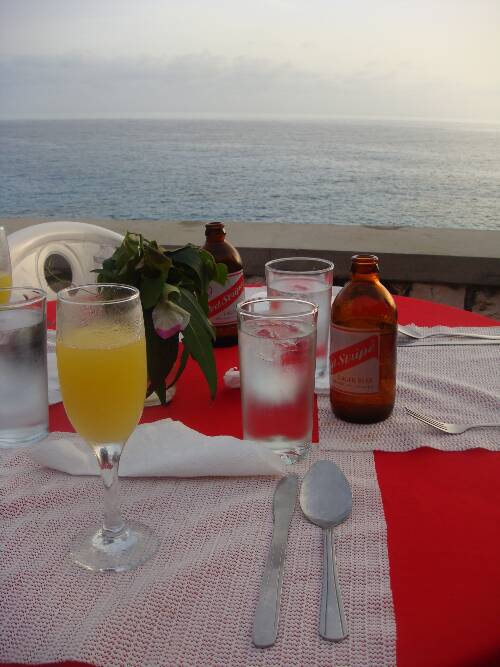 We unload from Seastar Van and walk right in to Bourbon Beach. Large open air place. Couple bars. Big stage. Right on beach. Not many people around. We are greeted when we walk in by a guy who says his name is Shabba and he works there. We are the only customers. He gets beach recliners set up for the group. Points out everything we need. Other couple had been here before and knew the ropes. Big open beach you could be in the sun or much more importantly I could be in the shade and the actual ocean was 15 feet away. The bar about 15 feet way. We start off with a few cold red stripes.